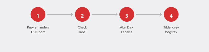 Nogle gange genkender Windows drevet, men tildeler ikke et drevbogstav. Højreklik på Start-knappen og derefter Diskhåndtering. Se efter dit eksterne drev på listen. Kan du se det uden et drevbogstav? Højreklik, Skift drevbogstav og stier, Tilføj, og tildel et bogstav.