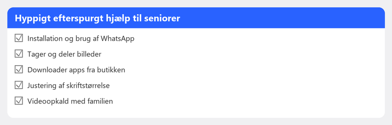 En smartphone eller tablet kan gøre dit liv mere behageligt. Hold kontakten med børn og børnebørn via videoopkald, deling af billeder i en familie-app eller blot at læse nyhederne på en større skærm. Men opsætning og brug af sådan en enhed er ikke altid ligetil. Det er okay. Vi hjælper dig gerne, roligt og i dit eget tempo.