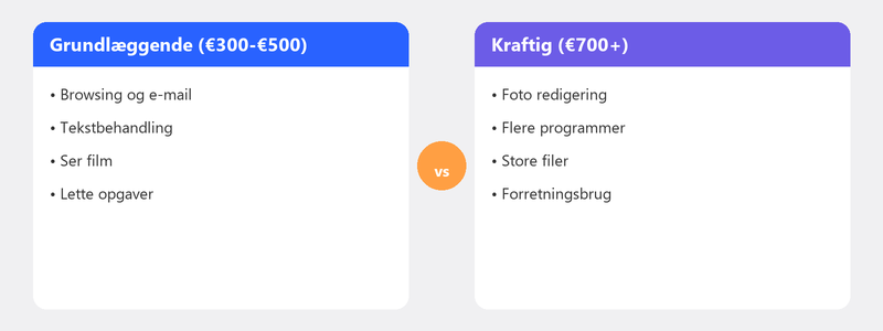 - Under 400 euro: Grundlæggende brug. E-mail, internet, simpel tekstbehandling.