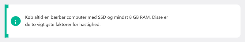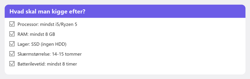 - Mac (MacBook): Et godt valg, hvis du allerede er i Apples økosystem. Kendt kvalitet og lang levetid, men dyrere og ikke kompatibel med al Windows-software.