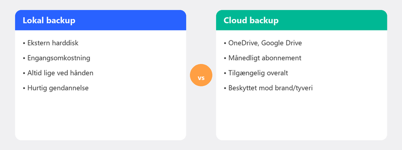 Cloud backup er den nemmeste mulighed for de fleste. OneDrive (indbygget i Windows) eller Google Drive synkroniserer automatisk dine mapper til servere på internettet. Dine filer er tilgængelige fra enhver enhed og beskyttet mod lokale katastrofer.