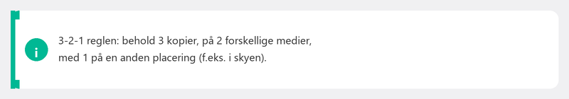 Professionelle bruger 3-2-1-reglen: behold tre kopier af dine filer (den originale plus to sikkerhedskopier) på to forskellige typer medier, med mindst én på en anden placering (for eksempel i skyen). Dette beskytter dig mod stort set alle scenarier.