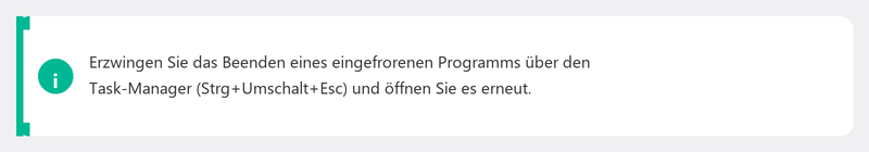 Das Programm ist eingefroren: Es führt keine Anweisungen mehr aus und reagiert nicht auf Klicks. Dies kann an einem Fehler im Programm liegen, an unzureichendem Arbeitsspeicher oder an einem Konflikt mit anderer Software. Beenden Sie es über den Task-Manager und öffnen Sie es erneut.