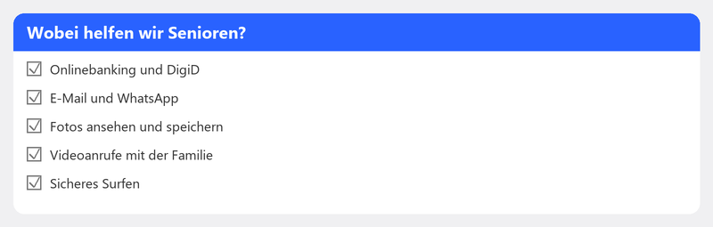 Die digitale Welt verändert sich schnell. Immer mehr Dinge laufen online: Bankgeschäfte, Kontakt mit dem Hausarzt, die Steuererklärung, Kontakt mit Enkeln per Videoanruf. Das ist praktisch, wenn man damit umgehen kann, aber frustrierend, wenn es nicht klappt. Und es ist absolut nicht seltsam, wenn Sie manchmal nicht weiterkommen. Wir helfen Ihnen gerne, ruhig und in Ihrem eigenen Tempo.