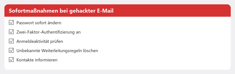 Deutliche Anzeichen sind: Sie können sich nicht mehr einloggen, obwohl Ihr Passwort nicht von Ihnen geändert wurde, Kontakte erhalten E-Mails, die Sie nicht gesendet haben, oder Sie sehen unbekannte Anmeldeaktivitäten in Ihren Sicherheitseinstellungen. Prüfen Sie auch Ihre E-Mail-Adresse auf haveibeenpwned.com, um zu sehen, ob sie bei einem Datenleck aufgetaucht ist.