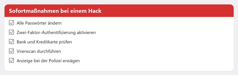 Aber Panik hilft nicht. Schnelles Handeln schon. Nachfolgend finden Sie einen Aktionsplan, der funktioniert, unabhängig davon, was genau gehackt wurde.