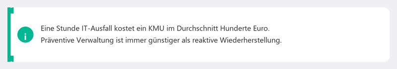 Die Kosten variieren, aber eine Orientierung: Rechnen Sie mit 25 bis 75 Euro pro Arbeitsplatz pro Monat, abhängig vom Umfang des Pakets. Das klingt nach einem Kostenfaktor, aber stellen Sie es dem Alternative gegenüber: ein Ad-hoc-IT-Dienstleister, der 80 bis 120 Euro pro Stunde berechnet und nicht verfügbar ist, wenn Sie ihn brauchen. Oder ein Tag Stillstand, der Sie zehntausend Euro kostet. IT-Verwaltung ist kein Kostenfaktor, sie ist eine Versicherung.