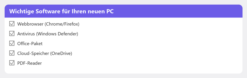 Ein neuer Computer hat nur die Basisprogramme. Denken Sie an: einen Browser (Chrome, Firefox oder Edge), Microsoft Office oder eine kostenlose Alternative, Antivirensoftware (Windows Defender ist standardmäßig aktiv), Zoom oder Teams, wenn Sie Videoanrufe tätigen, und eventuell Programme für Ihr Hobby oder Ihre Arbeit.