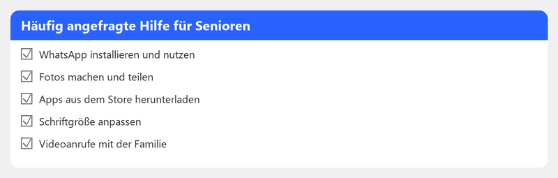 Ein Smartphone oder Tablet kann Ihr Leben angenehmer machen. Kontakt halten mit Kindern und Enkeln per Videoanruf, Fotos teilen in einer Familien-App oder einfach die Nachrichten auf einem größeren Bildschirm lesen. Aber das Einrichten und Bedienen eines solchen Geräts ist nicht immer selbstverständlich. Das ist nicht schlimm. Wir helfen Ihnen gerne, ruhig und in Ihrem eigenen Tempo.