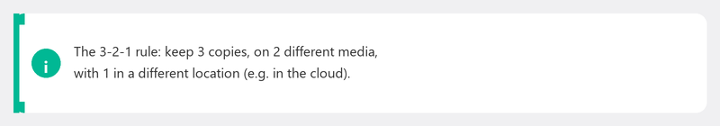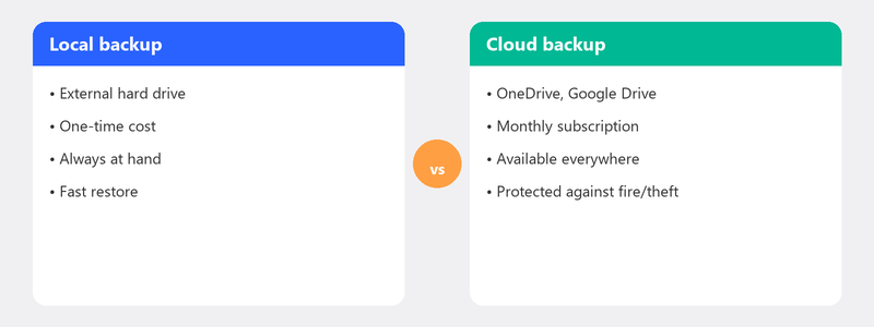 Professionals use the 3-2-1 rule: keep three copies of your files (the original plus two backups), on two different types of media, with at least one in a different location (for example in the cloud). This protects you against virtually any scenario.