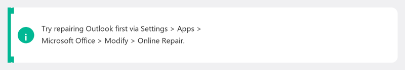 If Outlook persistently crashes or gives error messages, try repairing Office. Go to Settings, Apps, Installed apps, find Microsoft 365 or Microsoft Office, click the three dots, and choose Modify. Select Online Repair (not Quick Repair, as that's less thorough). This reinstalls all Office files without deleting your data.