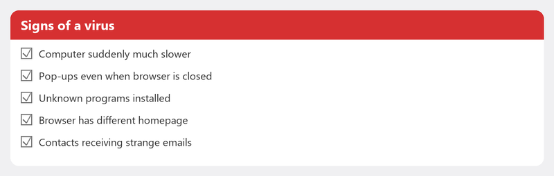 Not every problem is a virus, but there are clear warning signs. Your computer has suddenly become much slower. Pop-ups appear even when your browser is closed. You see programs you don't recognize. Your browser has a different homepage. Contacts are receiving strange emails from your address. If you recognize one or more of these symptoms, it's time to take action.