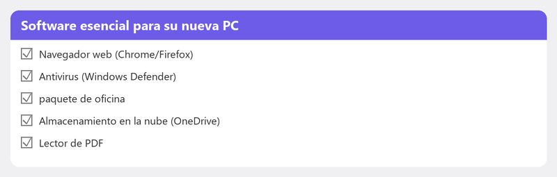 Una computadora nueva solo tiene los programas básicos. Piensa en: un navegador (Chrome, Firefox o Edge), Microsoft Office o una alternativa gratuita, software antivirus (Windows Defender ya está activo de forma predeterminada), Zoom o Teams si realizas videollamadas y cualquier programa para tu hobby o trabajo.