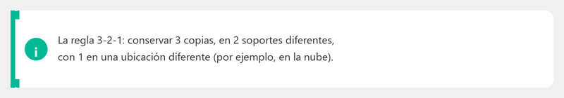 Los profesionales utilizan la regla 3-2-1: guarde tres copias de sus archivos (el original más dos copias de seguridad), en dos tipos diferentes de soporte, con al menos una en una ubicación diferente (por ejemplo, en la nube). Esto lo protege contra prácticamente cualquier escenario.