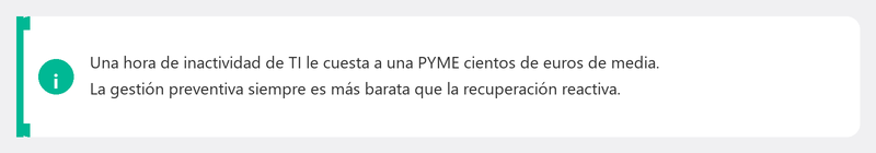 Haz los cálculos. Un día de inactividad debido a un problema informático ya le cuesta a una empresa con diez empleados miles de euros en pérdida de productividad. Un ataque de ransomware puede costar semanas de trabajo, además de daños a la reputación. Una violación de datos que involucre datos de clientes puede resultar en una multa del RGPD. Y todo ello mientras la gestión remota de TI cuesta menos que la suscripción a una máquina de café.