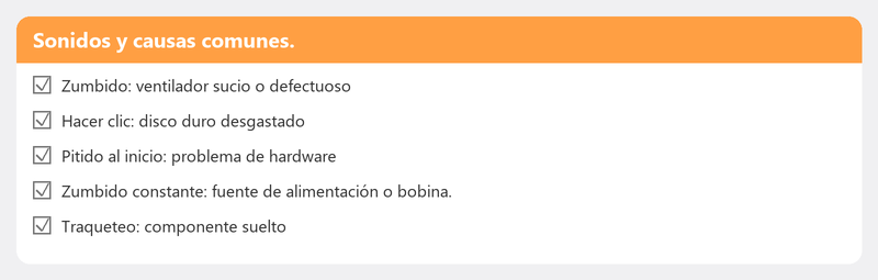 Con sonidos de tictac o clic (disco duro), pitidos continuos al inicio (fallo de hardware) o un sonido de traqueteo que no ha escuchado antes. Comience siempre con una copia de seguridad.