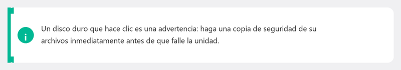 Esta es una señal de advertencia. Un disco duro tradicional (HDD) contiene platos giratorios y un brazo de lectura. Un tic rítmico o un clic puede significar que el brazo de lectura está dañado y que la unidad está a punto de fallar.