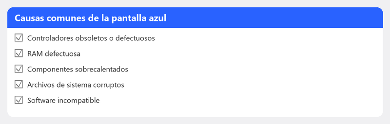 Una pantalla azul puede tener varias causas. Los más comunes son problemas con los controladores (un controlador que no funciona bien con Windows), una actualización reciente de Windows que interrumpió algo, memoria (RAM) defectuosa, sobrecalentamiento del procesador o, en casos excepcionales, malware. El problema suele ocurrir poco después de una actualización o de instalar nuevo hardware o software.