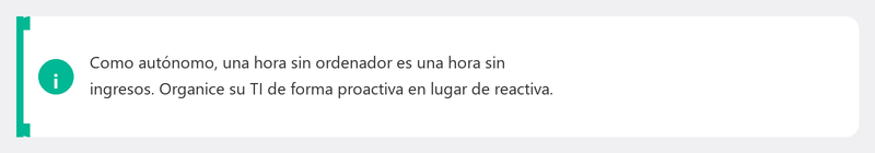 El soporte informático es reactivo: llamas cuando algo falla. La gestión de TI es proactiva: alguien monitorea sus sistemas, los mantiene actualizados y previene problemas. La mayoría de los autónomos se benefician de una combinación de ambos.
