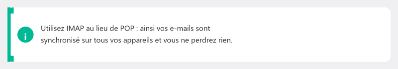 Quelle est la différence ? IMAP synchronise votre messagerie avec le serveur : vous voyez la même boîte de réception sur tous vos appareils. POP3 télécharge les e-mails sur un appareil et les supprime du serveur. Pour la plupart des gens, IMAP est le meilleur choix.