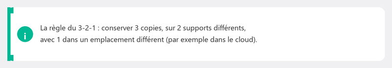 Les professionnels utilisent la règle du 3-2-1 : conservez trois copies de vos fichiers (l'original plus deux sauvegardes), sur deux types de supports différents, dont au moins une dans un emplacement différent (par exemple dans le cloud). Cela vous protège contre pratiquement tous les scénarios.
