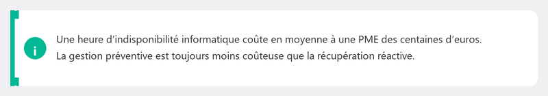 Les coûts varient, mais à titre indicatif : comptez 25 à 75 euros par poste de travail et par mois, selon l'étendue du forfait. Cela ressemble à une dépense, mais comparez-la à l'alternative : un informaticien ad hoc qui facture 80 à 120 euros de l'heure et n'est pas disponible quand vous en avez besoin. Ou une journée d'arrêt qui vous coûte dix mille euros. La gestion informatique n'est pas un coût : c'est une assurance.