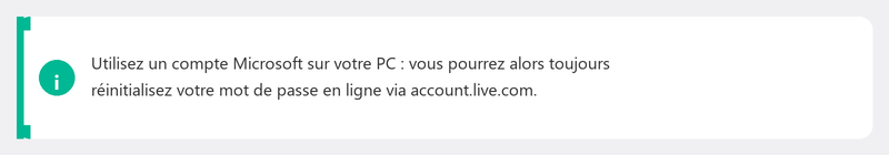 Si vous disposez d'un compte local sans adresse e-mail associée, vous aurez besoin de questions de sécurité, d'un autre compte administrateur ou d'un lecteur de récupération. Après la réinitialisation, associez une adresse e-mail pour le futur.