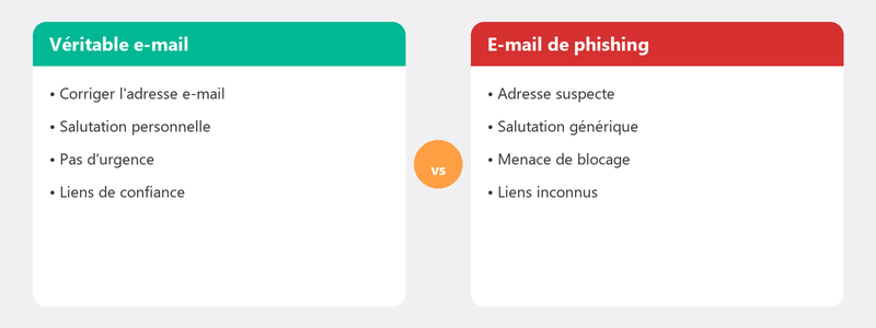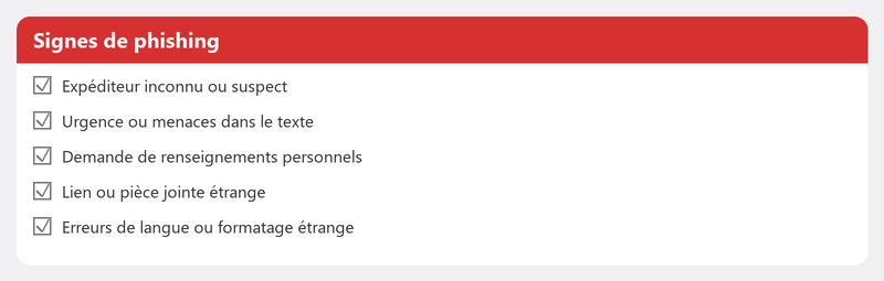 - Message inattendu. Vous recevez un email concernant un colis que vous n'attendez pas, une facture que vous ne reconnaissez pas ou un compte que vous n'avez pas. C'est le premier signal d'alarme.