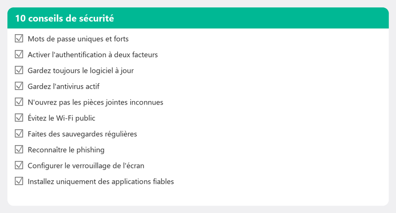 N'oubliez pas vos appareils mobiles. Configurez un verrouillage d'écran (PIN, empreinte digitale ou reconnaissance faciale). Gardez les applications et le système d'exploitation à jour. Soyez critique à l'égard des autorisations des applications : une application lampe de poche n'a pas besoin d'accéder à vos contacts.