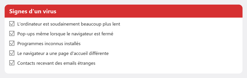 Tous les problèmes ne sont pas des virus, mais il existe des signes avant-coureurs clairs. Votre ordinateur est soudainement devenu beaucoup plus lent. Les pop-ups apparaissent même lorsque votre navigateur est fermé. Vous voyez des programmes que vous ne reconnaissez pas. Votre navigateur a une page d'accueil différente. Les contacts reçoivent des e-mails étranges provenant de votre adresse. Si vous reconnaissez un ou plusieurs de ces symptômes, il est temps d’agir.