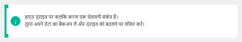 यह एक चेतावनी संकेत है. एक पारंपरिक हार्ड ड्राइव (HDD) में स्पिनिंग प्लेटर्स और एक रीड आर्म होता है। लयबद्ध टिक-टिक या क्लिक ध्वनि का मतलब यह हो सकता है कि रीड आर्म क्षतिग्रस्त हो गया है और ड्राइव विफल होने वाली है।