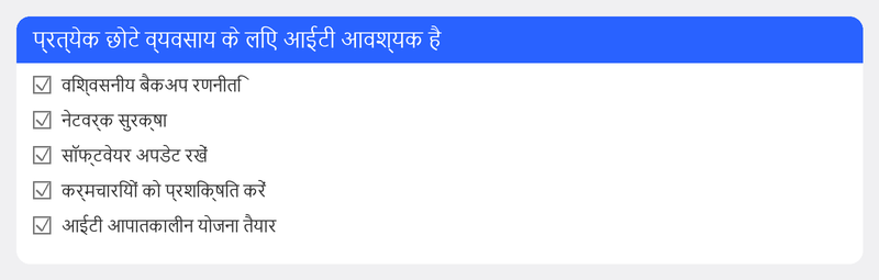 केवल दो कर्मचारियों से, यह पहले से ही सार्थक है। जैसे ही आपका व्यावसायिक डेटा कई उपकरणों पर रहता है और आप इंटरनेट और ईमेल पर निर्भर होते हैं, आपको पेशेवर प्रबंधन से लाभ होता है। इसका बड़ा या महँगा होना ज़रूरी नहीं है: एक बुनियादी पैकेज कई छोटे व्यवसायों के लिए पर्याप्त है।