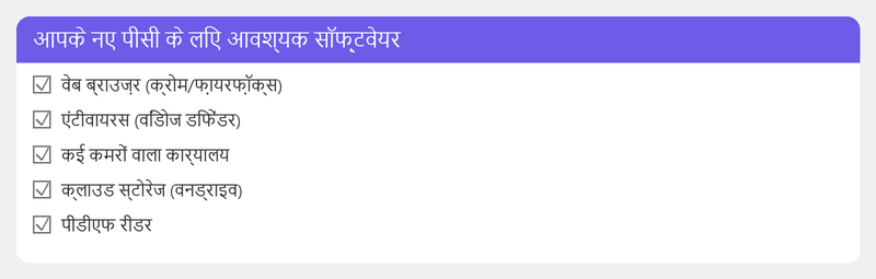 एक नये कंप्यूटर में केवल बुनियादी प्रोग्राम होते हैं। इसके बारे में सोचें: एक ब्राउज़र (क्रोम, फ़ायरफ़ॉक्स, या एज), माइक्रोसॉफ्ट ऑफिस या एक मुफ्त विकल्प, एंटीवायरस सॉफ़्टवेयर (डिफ़ॉल्ट रूप से विंडोज डिफेंडर पहले से ही सक्रिय है), यदि आप वीडियो कॉल करते हैं तो ज़ूम या टीमें, और आपके शौक या काम के लिए कोई प्रोग्राम।