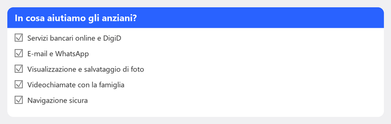 Il mondo digitale cambia velocemente. Sempre più cose si fanno online: operazioni bancarie, contatti con il medico, compilazione delle dichiarazioni dei redditi, videochiamate con i nipoti. È comodo se ti senti a tuo agio, ma frustrante quando non funziona. E non c'è assolutamente niente di sbagliato nel rimanere bloccati a volte. Siamo felici di aiutarti, con calma e al tuo ritmo.