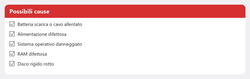 La regola pratica: niente luci e niente suono = hardware. Luci accese e ventola che gira ma nessun display = probabilmente hardware (grafica) o software. Il computer raggiunge il logo di Windows ma non va oltre = software. E i problemi software possono spesso essere risolti da remoto.