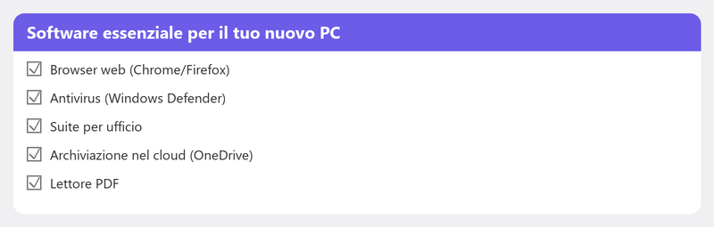 Un nuovo computer ha solo i programmi di base. Pensa a: un browser (Chrome, Firefox o Edge), Microsoft Office o un'alternativa gratuita, un software antivirus (Windows Defender è già attivo di default), Zoom o Teams se fai videochiamate ed eventuali programmi per il tuo hobby o lavoro.