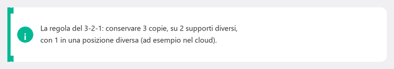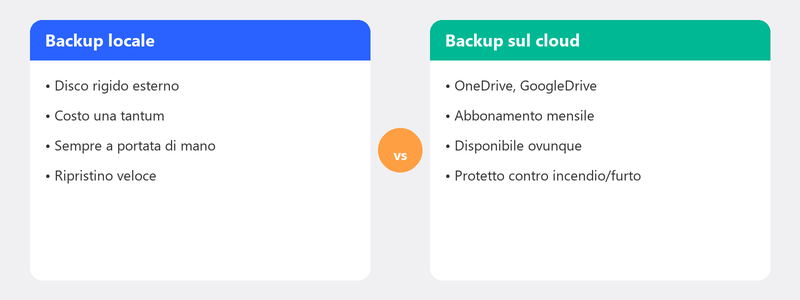 I professionisti utilizzano la regola 3-2-1: conserva tre copie dei tuoi file (l'originale più due backup), su due diversi tipi di supporto, di cui almeno una in una posizione diversa (ad esempio nel cloud). Questo ti protegge praticamente da qualsiasi scenario.