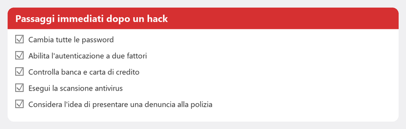 Segni chiari: non riesci ad accedere anche se utilizzi la password corretta, i contatti ricevono messaggi che non hai inviato, vedi posizioni di accesso sconosciute nelle impostazioni del tuo account o transazioni sui rapporti bancari che non riconosci. In caso di dubbio: comportati come se fossi stato hackerato e modifica preventivamente le tue password.