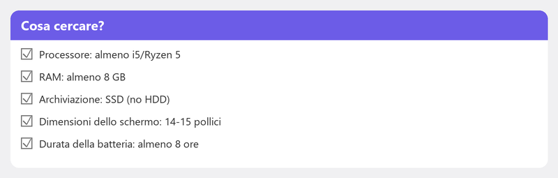 - Mac (MacBook): una buona scelta se fai già parte dell'ecosistema Apple. Qualità nota e lunga durata, ma più costoso e non compatibile con tutti i software Windows.