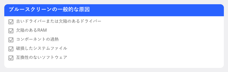 エラー コード (停止コード) は、Windows のどの部分が問題の原因となったかを示します。各コードは特定の種類のエラーを指します。コードを調べると、原因を特定するのに役立ちます。最も一般的なものは、ドライバーまたはメモリ関連の問題を示しています。