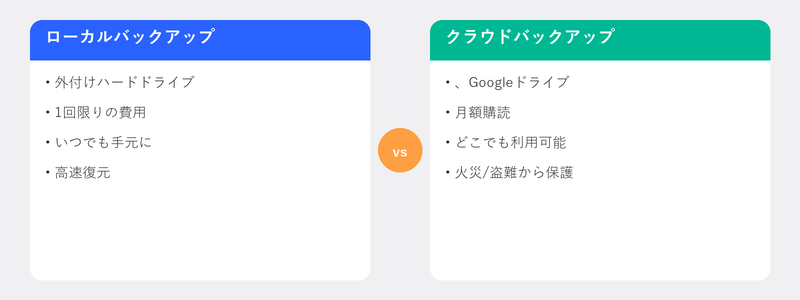 バックアップとは、単に別の場所にあるファイルのコピーです。元のファイルが失われた場合は、バックアップから復元できます。バックアップがなければ、高価な専門のデータ回復サービスに依存することになりますが、それらのサービスでも常にすべてを保存できるとは限りません。