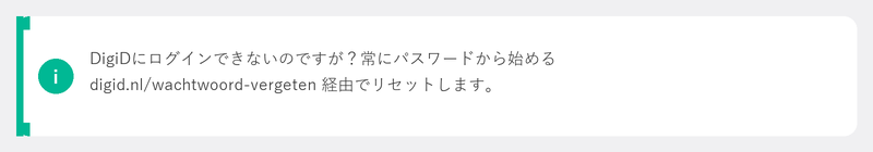ログイン試行の失敗が多すぎると、DigiD は一時的にブロックされます。 1 時間待ってからもう一度試してください。まだ入れませんか? digid.nl で新しいパスワードをリクエストしてください。あなたのアカウントはそのまま残ります。パスワードのみがリセットされます。