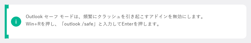 Windows キーを押し、「outlook.exe /safe」と入力して Enter キーを押します。または、Ctrl キーを押したまま Outlook アイコンをクリックします。セーフ モードではアドインが無効になるため、クラッシュの原因を特定するのに役立ちます。