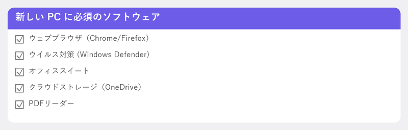 新しいコンピュータには基本的なプログラムしか入っていません。ブラウザー (Chrome、Firefox、または Edge)、Microsoft Office または無料の代替ソフトウェア、ウイルス対策ソフトウェア (Windows Defender はデフォルトですでに有効になっています)、ビデオ通話を行う場合は Zoom または Teams、趣味や仕事用のプログラムを考えてみましょう。