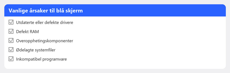 En blå skjerm kan ha ulike årsaker. Det vanligste er driverproblemer (en driver som ikke fungerer bra med Windows), en nylig Windows-oppdatering som forstyrret noe, feil minne (RAM), overoppheting av prosessoren eller i sjeldne tilfeller skadelig programvare. Problemet oppstår ofte kort tid etter en oppdatering eller installasjon av ny maskinvare eller programvare.