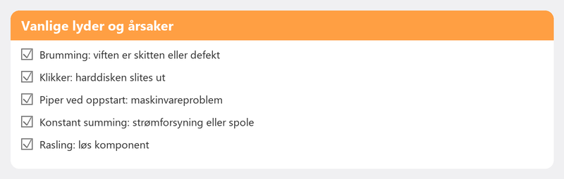 Med tikkende eller klikkelyder (harddisk), kontinuerlig pipelyd ved oppstart (maskinvarefeil), eller en raslelyd du ikke har hørt før. Start alltid med en sikkerhetskopi.