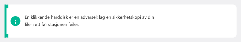 Dette er et varselsignal. En tradisjonell harddisk (HDD) inneholder roterende tallerkener og en lesearm. En rytmisk tikkende eller klikkelyd kan bety at lesearmen er skadet og stasjonen er i ferd med å svikte.