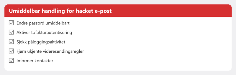 Hackere bruker ofte en hacket e-postkonto for å sende phishing-e-post til alle kontakter. Dine venner, familie og kolleger mottar deretter e-poster som ser ut til å komme fra deg, med mistenkelige linker. Send en melding (via en annen kanal, som WhatsApp) for å advare kontaktene dine om ikke å åpne noe de nylig har mottatt fra deg.