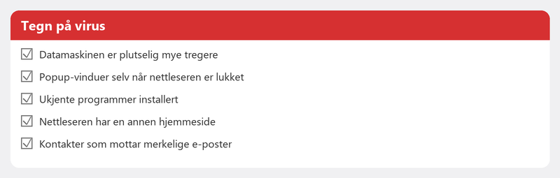 Ikke alle problemer er virus, men det er klare advarselstegn. Datamaskinen din har plutselig blitt mye tregere. Popup-vinduer vises selv når nettleseren din er lukket. Du ser programmer du ikke kjenner igjen. Nettleseren din har en annen hjemmeside. Kontakter mottar merkelige e-poster fra adressen din. Hvis du gjenkjenner ett eller flere av disse symptomene, er det på tide å iverksette tiltak.