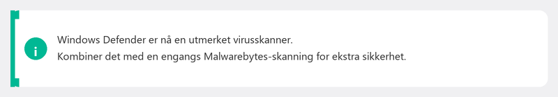For de fleste: ja. Windows Defender scorer på samme måte som betalte alternativer i uavhengige tester. Kombiner det eventuelt med en engangs Malwarebytes-skanning for ekstra sikkerhet.